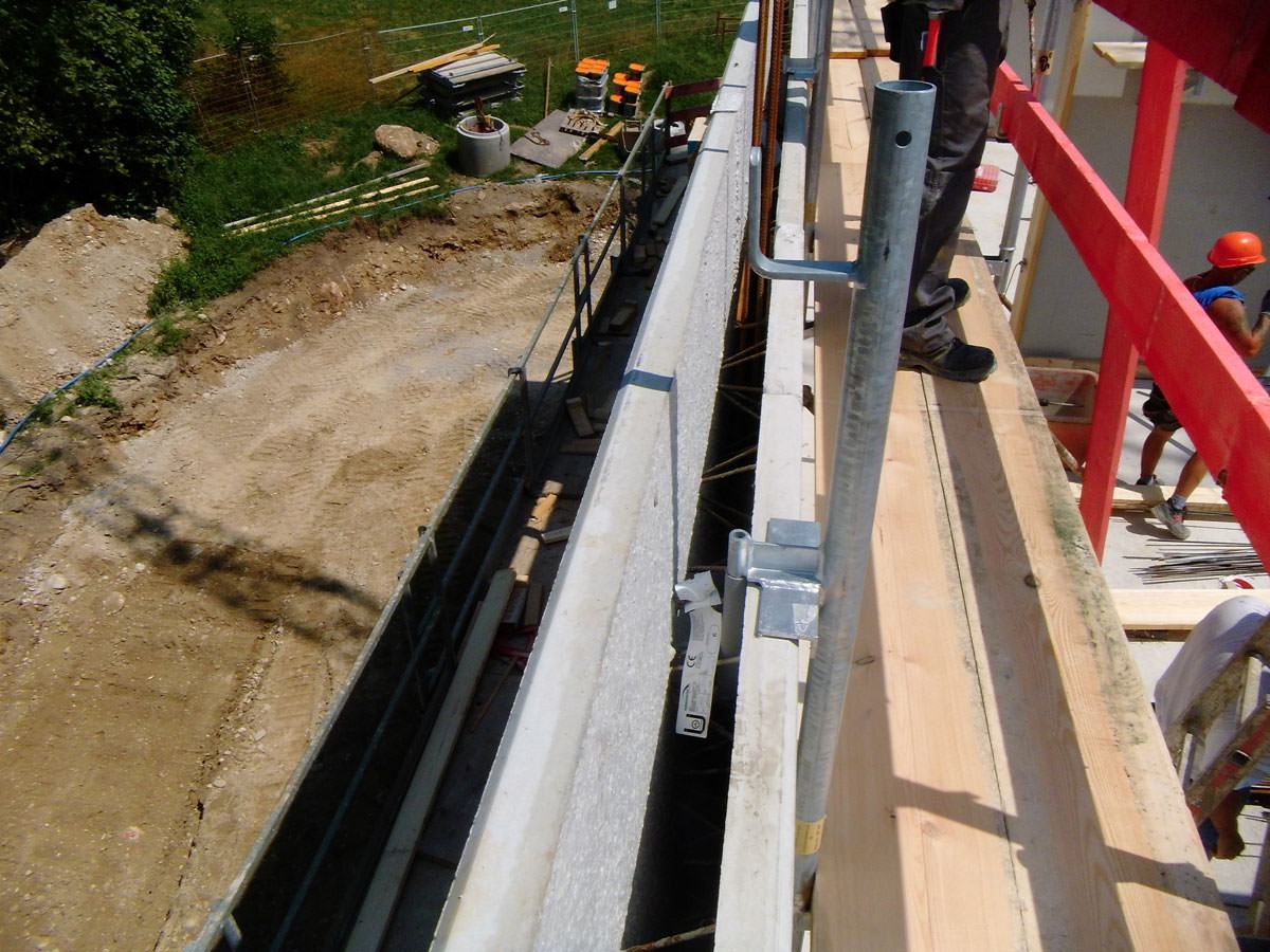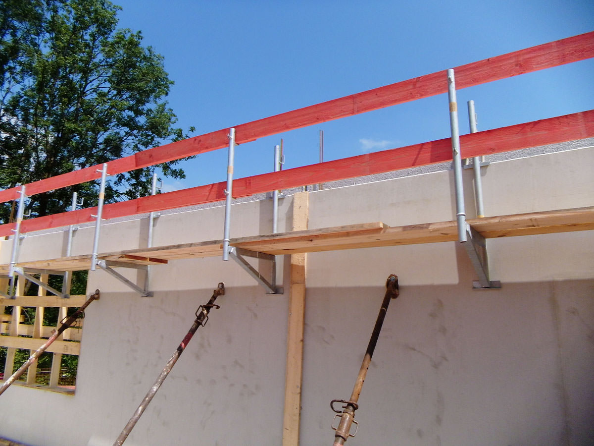 Einfache bzw. schnelle Montage an bewehrten Hohl- bzw. FT-Wänden bis 8 cm Stärke. Konsolen über die Wände hängen, Einhängehaken mit bauseitigem Leerrohr (inkl. Verschlussstopfen) versehen, mit Layher Gerüstböden bzw. systemfreien Gerüstbohlen belegen, fertig!
