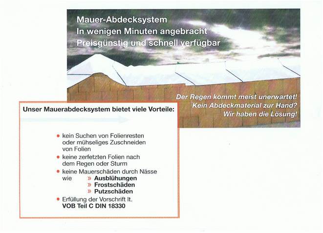 Der Layher Mauerschutz, das Mauer-Abdecksystem zur Verhinderung von Mauerschäden, erfüllt die Vorschrift lt. VOB Teil C DIN 18330.