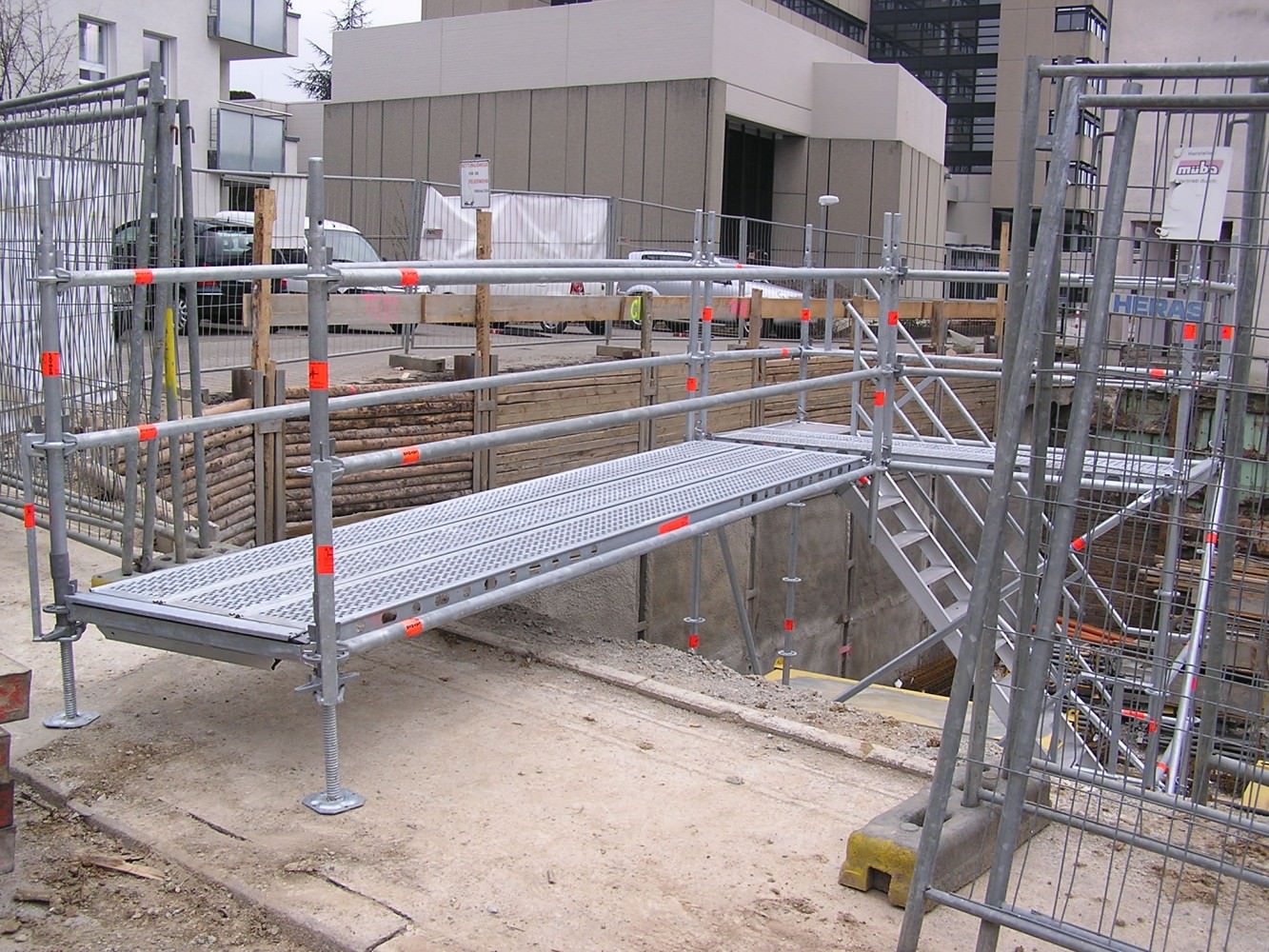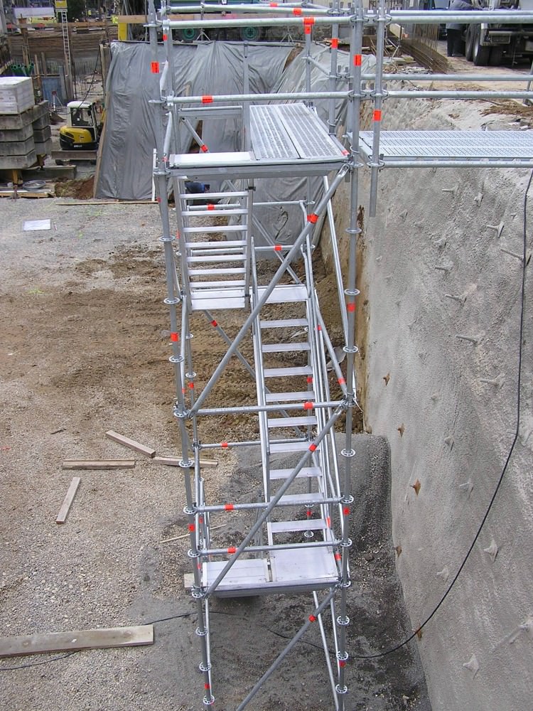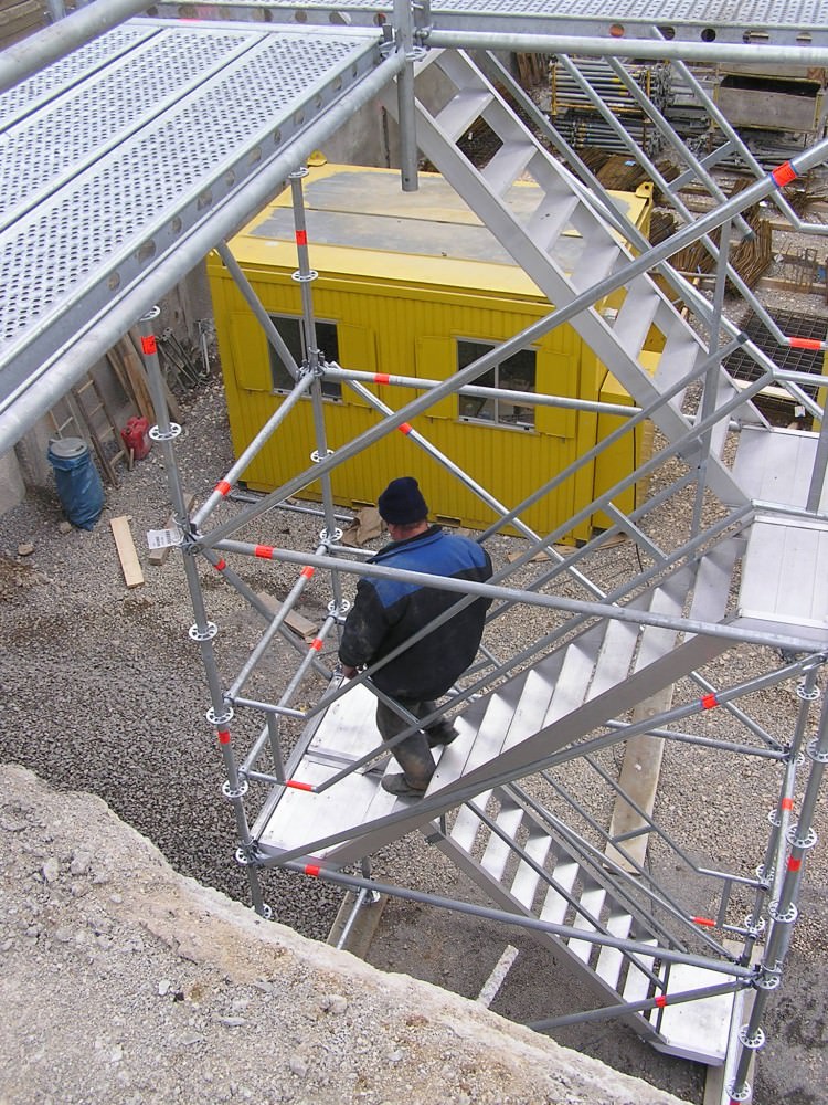 Beim integrierten Leiternaufstieg erschweren die engen Durchstiegsöffnungen die Arbeit, vor allem, wenn Arbeitsmaterial oder Werkzeug mitgeführt wird. Auch Architekten und Bauleiter wissen die Vorzüge der Layher Podesttreppe zu schätzen, besonders wenn das Gerüst nicht in Arbeitskleidung bestiegen wird.